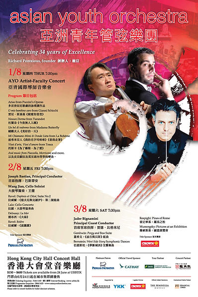 AYO International Artist-Faculty concert brings together distinguished musicians from Belgium, Italy, USA, Hong Kong, Korea and Taiwan. On the Occasion of the 100th anniversary of the passing of Italian composer Puccini, they will perform several arias from his operas, as well as some other repertoire to demonstrate not only their vituosity but also impart invalueable knowledge and inspiration to the next generation of musicians.